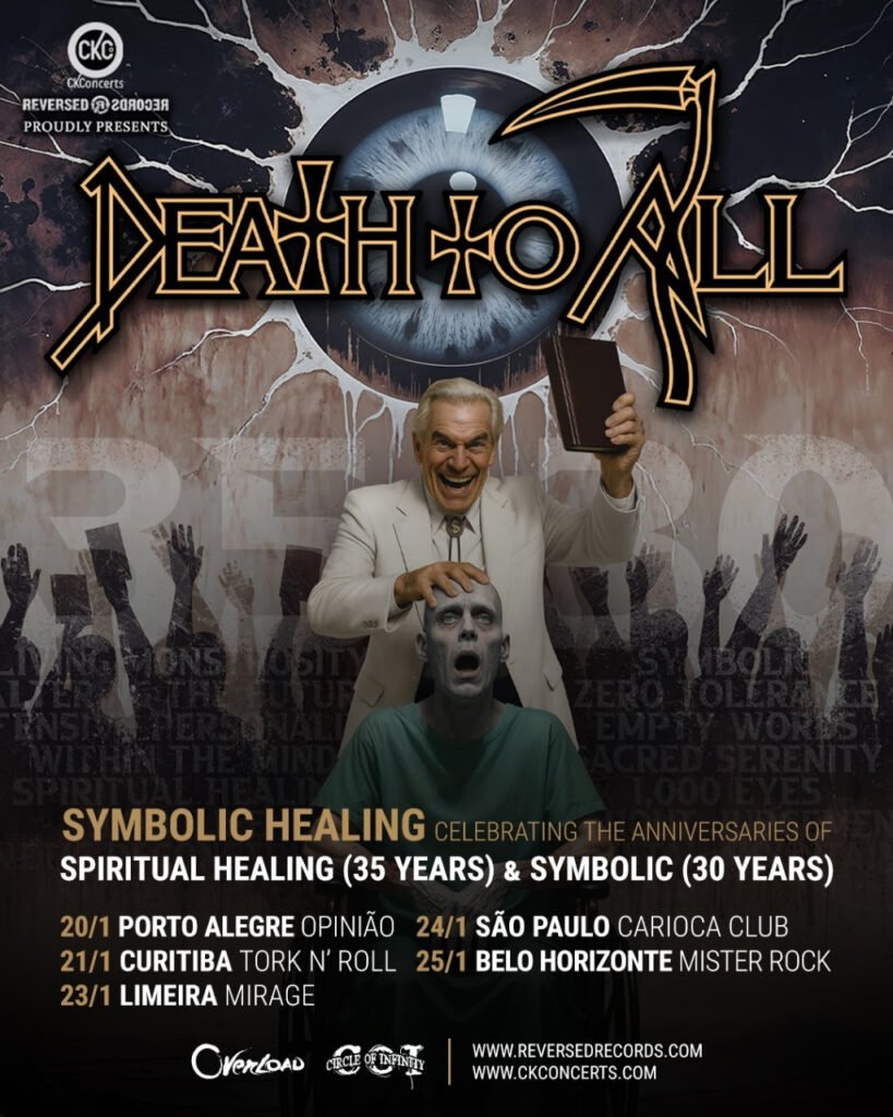 Death To All, projeto/turnê-tributo com ex-membros da banda norte-americana Death, está no Brasil para celebrar ao vivo os clássicos álbuns Spiritual Healing e Symbolic, que respectivamente completam 35 e 30 anos desde seus lançamentos na década de 1990. A turnê acontece de 20 a 25 de janeiro em cinco cidades.