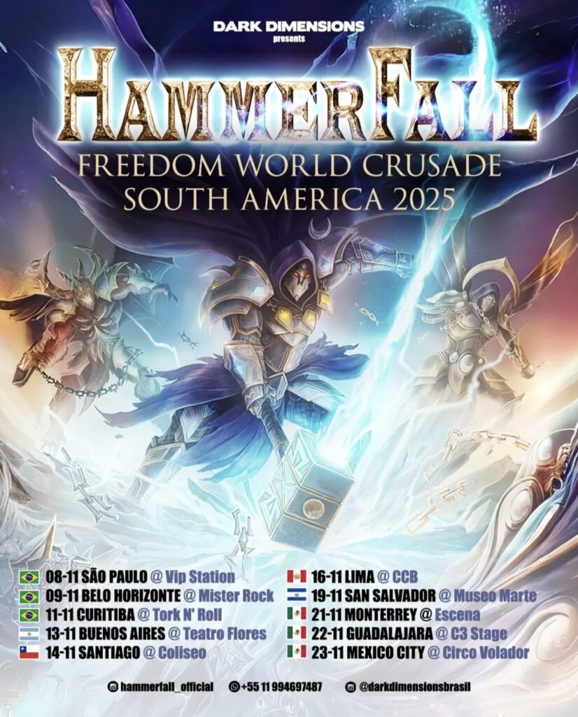 Os suecos do HammerFall, uma das maiores potências do power metal mundial, acabam de confirmar sua volta à América do Sul em novembro de 2025. A banda traz a turnê “Freedom World Crusade”, que promete um setlist recheado de clássicos e novos hinos que marcaram sua trajetória de quase três décadas.